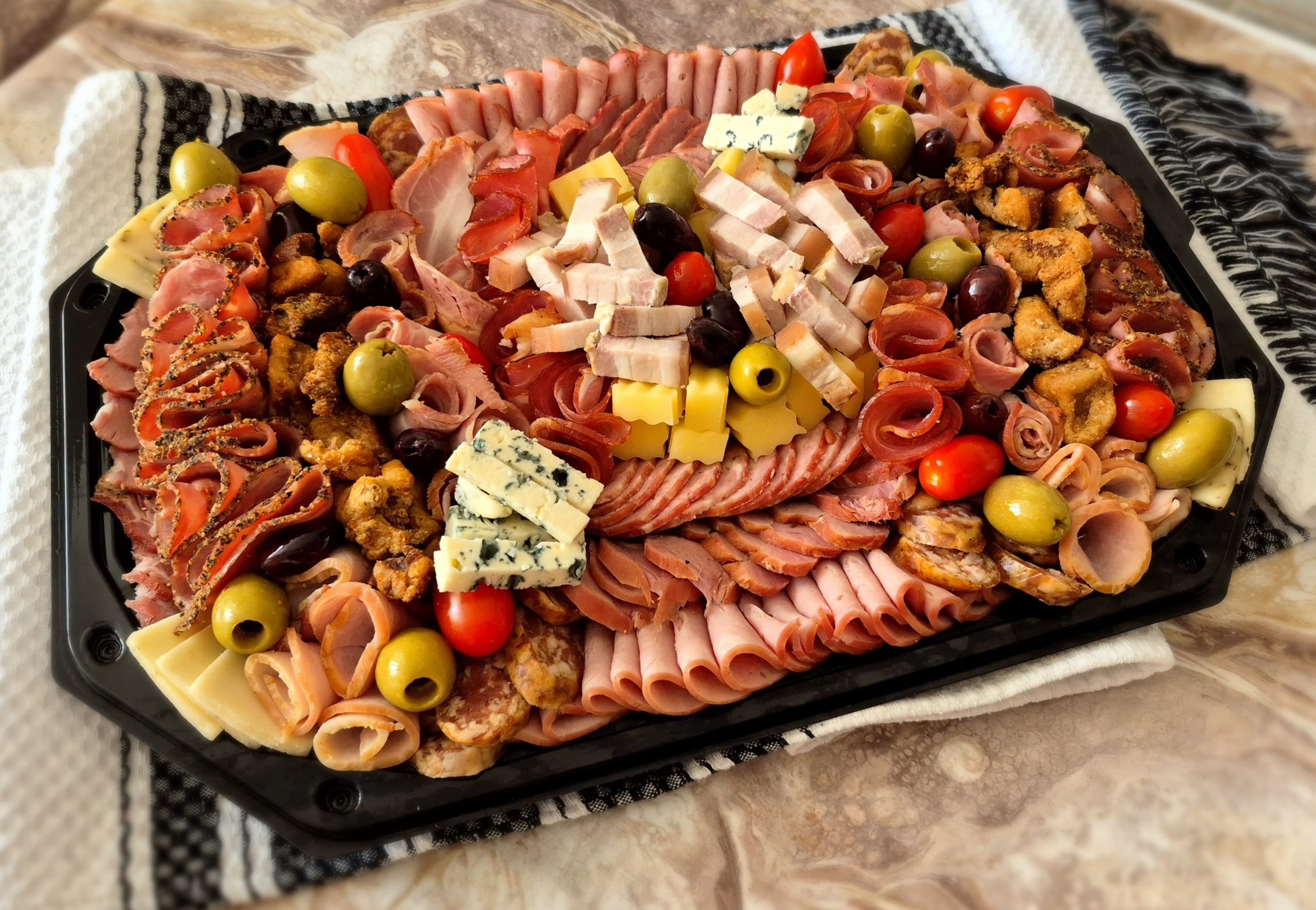 INGREDIENTE: Mușchiuleț Afumat de Porc, Salam din Ceafă Pepper Crust, Pastramă de Porc, Slăninuță Premium Afumată cu Carne, Ceafă Maturată și Afumată, Salam Uscat Summer Dried, Cârnați Uscați, Cotlet Afumat, Cârnați Subțiri Uscați și Afumați Sticks, Salam Classic (Porc & Vită), Bacon Afumat. 10% brânză maturată și decor de măsline și jumeri.